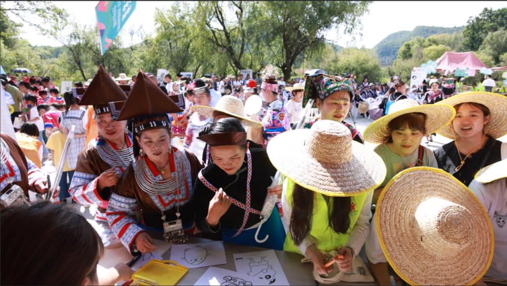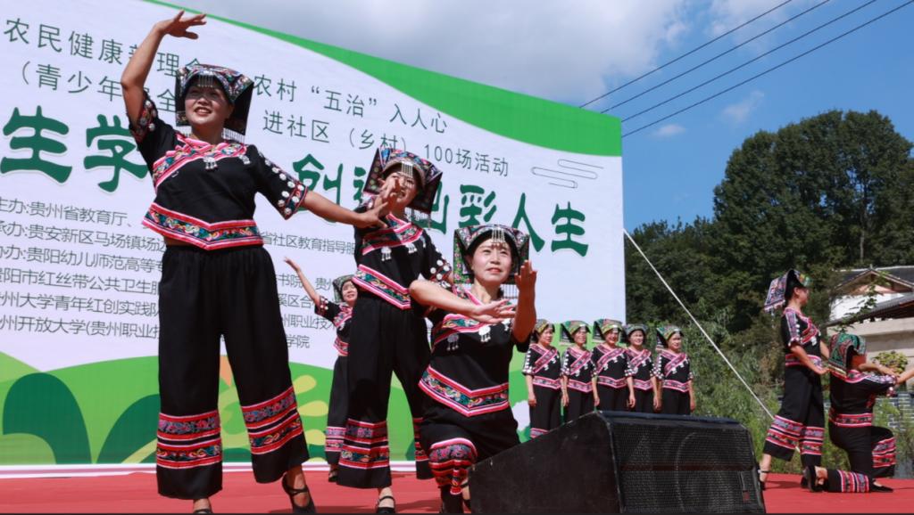 活动现场由贵阳幼儿师范高等专科学校、贵州开放大学(贵州职业技术学院)艺术与设计学院开设的未成年防性侵教育、艺术彩绘等活动专区,深受小朋友们的喜爱。青少年小朋友们通过游戏互动,了解了自我保护安全知识讲解;用颜料、彩笔描绘着幸福的生活。为活跃现场氛围,贵州播雅书院、新民村及贵州开放大学(贵州职业技术学院)艺术与设计学院纷纷准备了精彩的表演节目,浓厚的民族歌舞节目展现了马场镇村民深厚的民族文化素养。