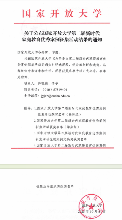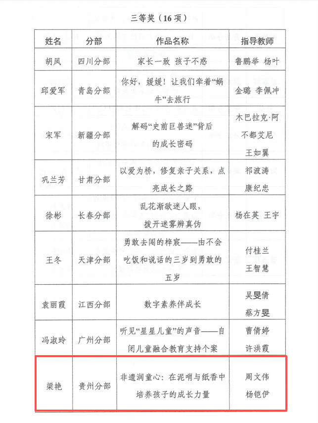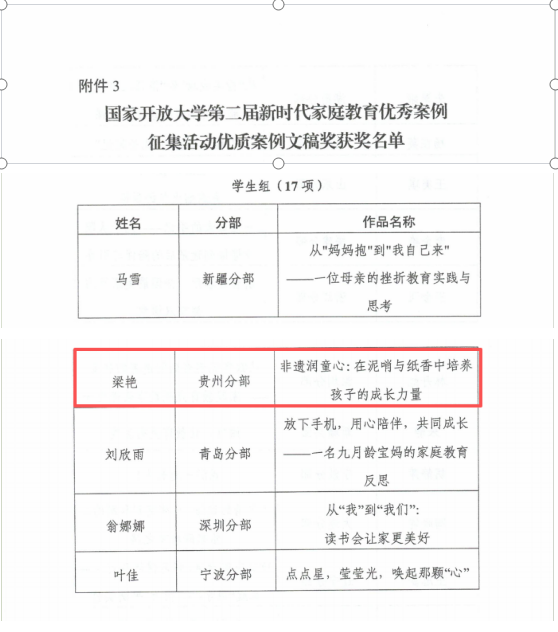 近日,国家开放大学正式公布了第二届新时代家庭教育优秀案例征集活动获奖名单。由贵州省社区教育指导服务中心选送的家庭教育案例《非遗润童心:在泥哨与纸香中培养孩子的成长力量》,荣获学生组三等奖及“优质案例文稿奖”双项荣誉!