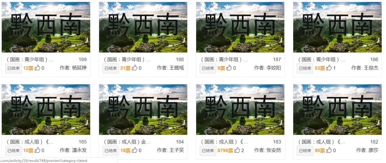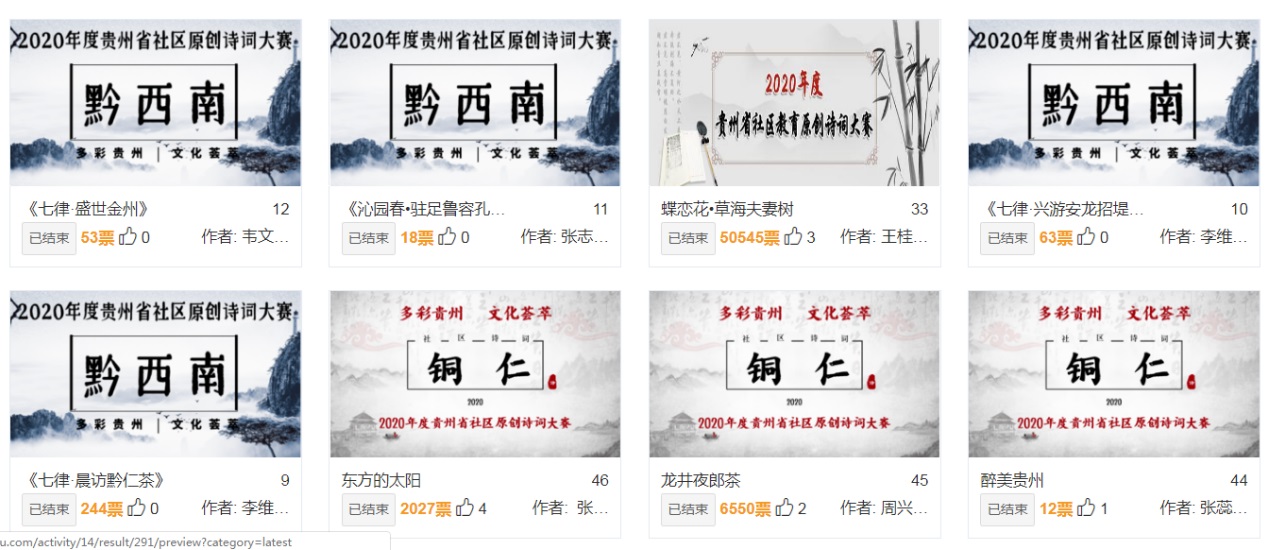 于2020年6月全面启动,历时5个月,在全省范围内组织实施了以“多彩贵州 文化荟萃”为主题,以原创诗词、摄影作品、书画作品为载体,展现贵州山水之美和风土人情,记录贵州经济社会发展取得的巨大成就,积极引导社区居民践行社会主义核心价值观,弘扬“团结奋进、拼搏创新、苦干实干、后发赶超”的新时代贵州精神。此次大赛共收到近千个作品,百余万人次通过乐之学习网——贵州社区教育学习平台参与线上投票。经过初赛、复赛、网上投票、专家打分等环节,产生一等奖作品25个,二等奖作品65个,三等奖作品110个,优秀组织单位18个,组织工作先进个人27名。贵州省2020年全民终身学习活动周开幕式上将对获奖单位和个人予以表彰,并展示部分获奖作品。