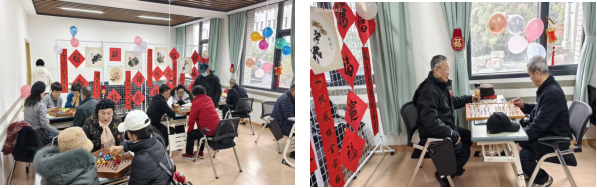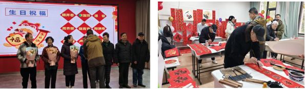 活动在欢声笑语中拉开帷幕。象棋、军棋、跳棋及扑克比赛现场气氛热烈,学员们以棋牌会友,切磋技艺;书法班师生挥毫泼墨,一幅幅春联传递着新春祝愿;集体生日会上,鲜花、贺卡与《生日快乐》歌声交织,温馨感人。
